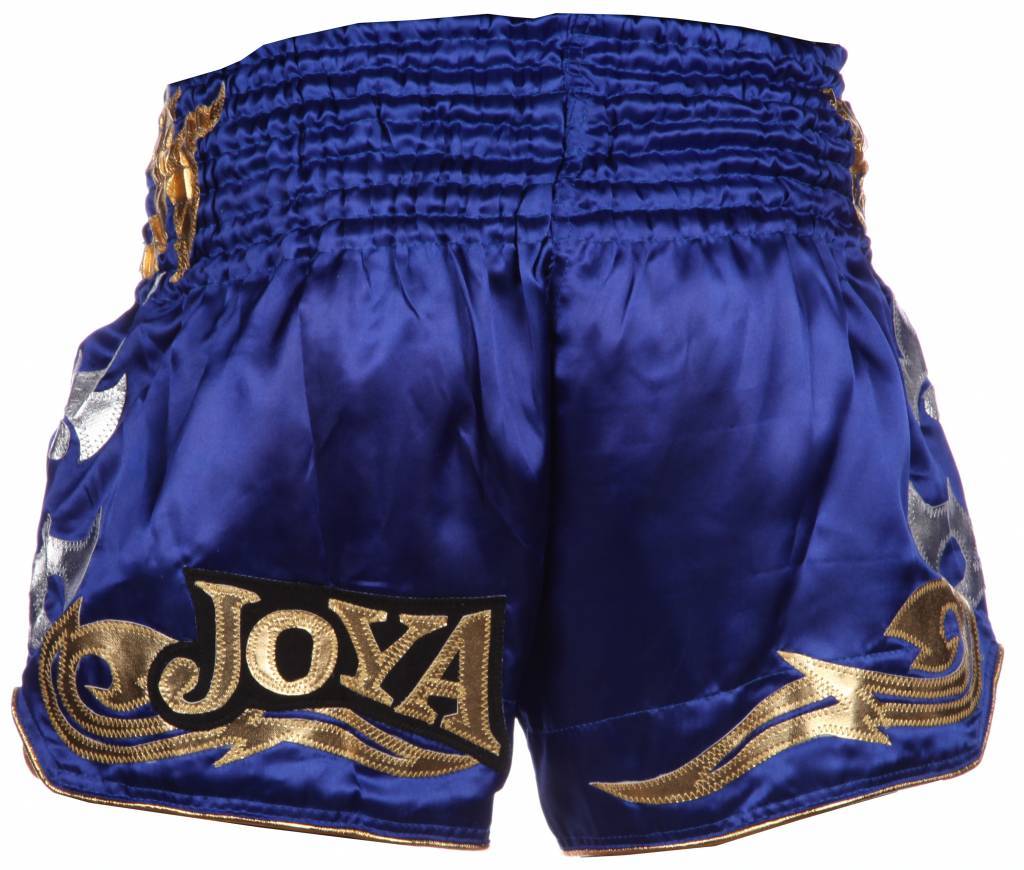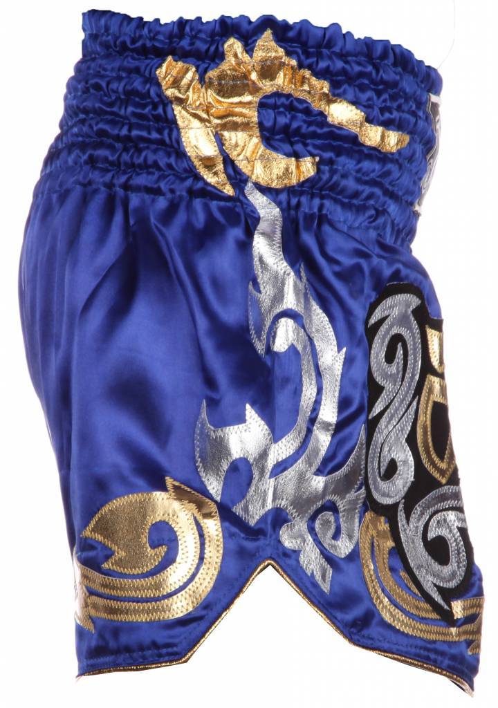 Blauw kickboks broekje met gouden en zilveren details.